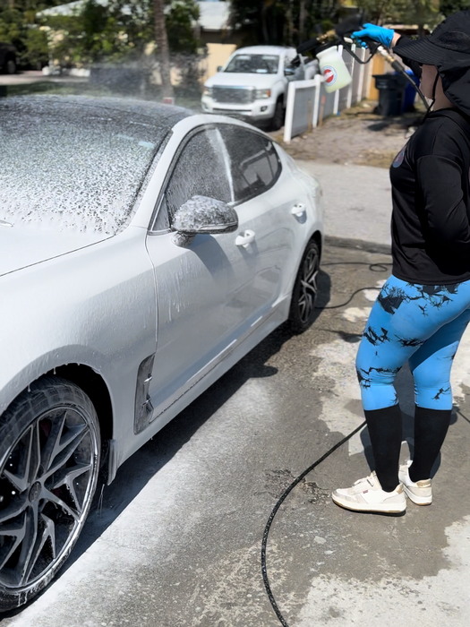 Bug removal, hand wash, gas cap cleaning, tire and rim cleaning and dressing, paint sealant with hydrophobic and UV rays protection. (Protection time for paint sealant lasts between 3-4 months)